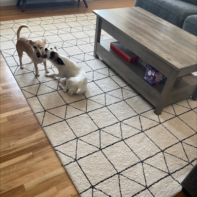 A: The rug is rectangular in shape, making it suitable for various room layouts.