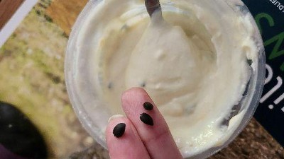 It is filled all throughout with tons of hard black seeds that do not seem edible or safe to eat. It says nothing about these really gross seeds and claims to be so creamy. We could not eat it at all.