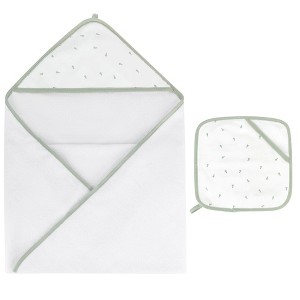 - This ultra-cozy, hooded towel and washcloth set features a sweet and whimsical, sage pear print on ivory jersey knit cotton embellished with a soft and neutral sage trim. Classic, comfortable and designed on-point with the latest fashion trends, this ultra-absorbent bath set is a must-have addition to your Baby Registry and modern d�cor.