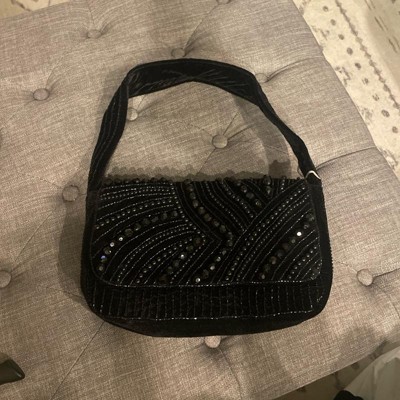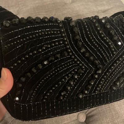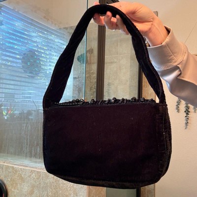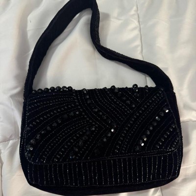 [This review was collected as part of a promotion.] This black velvet handbag with beaded embellishment is very cute and perfect for the holiday season. It has tonal beading to add a subtle sparkle. I feel that strap is too short to put on my shoulder comfortably so I would use it as a true handbag. There are also no pockets at all on the inside and just the one snap clasp. It will be nice for holiday parties and events!