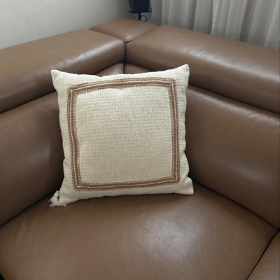 Embroidered Frame Square Throw Pillow Cream/Dark Tan - Threshold™ designed with Studio McGee: Cotton Blend, Zipper Closure, Indoor Use