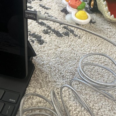 [This review was collected as part of a promotion.] This is the Emerald USB type C fast charging cable. It is a 10’ cord which works perfectly with my iPad. I currently have a 6 foot cable but it is almost too short. This cord charges so quick and is the perfect length for sitting on the couch or laying down in bed charging while using your device. I also have a 3 row vehicle so it can be plugged in up front for someone using the iPad in the very back. If you need to plug into a wall plug you will need to provide the charging plug or in my car I had to get the car charging adapter. One thing I really like is this cord has a small Velcro band so if you do not need 10’ you can roll up the cord and not have loose cord piled up on the floor. I received an incentive to write this review.