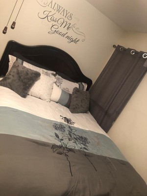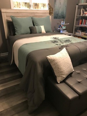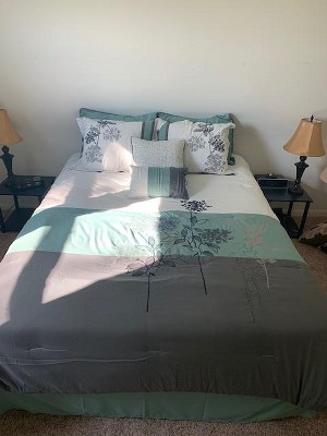 Love the comforter, the color is pretty much exactly as you see online - charcoal gray, white and a medium shade of seafoam green - which is what I was looking for. I don't know why they say blue in the description. If you are looking for something with blue accents, do not buy this! Other than that, it is a very nice quality comforter, very soft - nice clean lines. I ordered the King size for a Queen size bed and it fits perfectly. I don't like messing with bed skirts as they are such a hassle to get on and off. This spread ended up covering perfectly, once I steamed all the wrinkles out!! It definitely needed a steaming as most comforters are pretty tightly packed and look horrible when first unwrapped. I'm not using the King shams at this point as my bed is only a Queen and I don't have that much room, but the Euros are working out really well. Only one negative and that is, there is a lot of white in the comforter and you'll have to be really careful with that getting dirty pretty quick. I keep my spread folded over at the top so the grey underside shows and I figure that should minimize the issue. Have no idea what it will look like after it's washed... Hopefully the material will hold up and not bunch at the bottom as will happen with a lot of comforters. I love the look in my new gray bedroom and the seafoam color has worked out great with additional accents in the room. I definitely recommend!