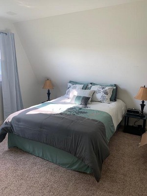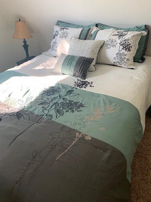 This color block comforter is really pretty. The comforter has a nice weight to it and is also reversible. There is a pretty, shiny dark gray on the other side. I love the color block on here. I would give it five stars but this comforter is gray, green and a very light, bright ivory. I believe the description says gray, blue and white. However, I do love the color combination and the green itself is a very soft color. It's very a very welcoming and inviting comforter set for our spare room.