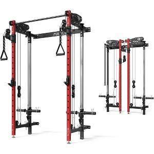 ER KANG Folding Squat Rack, Wall Mounted Power Rack with Cable Crossover Machine&LAT Pull Down, Functional Trainer with 5 Function Modes, Red