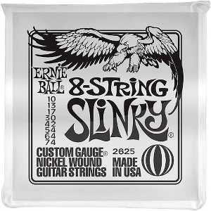 Ernie Ball 8-String Slinky Electric Guitar Strings are widely revered for their world class tone. These strings are precision manufactured to the highest standards and most exacting specifications to ensure consistency, optimum performance, and long life. Ernie Ball 8 String Slinky wound strings are made from nickel plated steel wire wrapped around a hex shaped steel core wire. The plain strings are made of specially tempered tin plated high carbon steel; producing a well balanced tone for guitar. Gauges 10-13-17-30-42-42-54-64-74