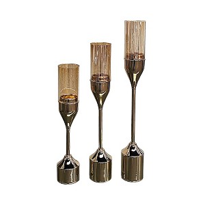 - Material: Metal and Glass Design: Each candle holder has a sleek, modern design with a tapered base and a slender stem. The stem holds a glass hurricane with a vertical ribbed or textured pattern.