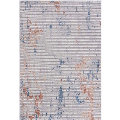 The modern style of this rug is underscored by an abstract pattern that features a harmonious blend of grey and blue hues punctuated with strokes of warm ochre, creating visual interest and contemporary appeal. The patterning suggests movement and fluidity, making this rug a dynamic centerpiece in any room.