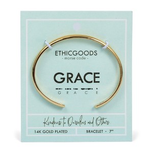 This classic gold Morse Code Cuff Bracelet is perfect for expressing yourself in a subtle, meaningful way. Handcrafted on a half-round, 14k gold plated metal, it features a stamped morse code pattern. Look great and stay ethical with this unique piece!Wed love to hear what your jewelry means to you. Share your story and photos with us! @ethicgoods