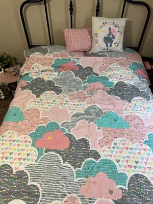 Drift off to dreamland with the whimsical charm of the Euphoria 6 Piece Cotton Reversible Daybed Set. The daybed showcases a cute and fluffy cloud motif in a soft colorful palette with a solid reverse. The 3 shams mirror the design of the comforter and reverses to solid color to perfectly complement the top of the bed. An embroidered decorative pillow with an adorable unicorn and a solid bed skirt add delightful finishing touches. Made from 100% cotton, this bedding set is also OEKO-TEX certified, meaning it does not contain any harmful substances or chemicals, and uses an antimicrobial treatment that provides built-in freshness protection, reducing the growth of odor causing bacteria to keep fabric lasting longer. The daybed cover fits a Twin size mattress.