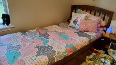 [This review was collected as part of a promotion.] I was looking for a light-weight, cheerful quilt for myself even though I’m definitely not a child. This whimsical-patterned set fits the bill. The soft colors and joyful design were exactly what I was looking for. The fabric is light and airy and perfect for the Spring and Summer months ahead. The two accent pillows make me smile every time I enter the room. It fits my queen-sized bed perfectly. And the shams add just the right finishing touch, although I wish they were a few inches longer. I’m very pleased with this entire set and look forward to many bright and cheery mornings.