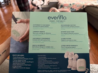 Introducing the NEW EVENFLO POCKET BREAST PUMP, your ultimate companion for convenient and efficient pumping. This compact and portable pump fits right into your bag, with a rechargeable battery that lasts up to 20 sessions, giving you the freedom to pump anytime, anywhere. Tailored for comfort, it offers 9 suction levels and 6 speed settings, allowing you to customize your experience, whether you prefer a soft, slow rhythm or a faster, more powerful suction to mimic baby. Operating quietly, it ensures discreet pumping with an included belt clip for portability. The soft silicone flanges provide a gentle fit, and the closed system makes it easy to clean with quick disassembly. In addition, with 3 memory presets, you can save your preferred settings for let-down and expression to start pumping with just a press of a button. Our double pumps have a 2-year warranty with proof of purchase. This warranty can be extended to 3 years when pump is registered online.