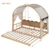 This extended twin size bed is designed to offer a luxurious and practical sleeping solution. It boasts a generous twin mattress space, providing extra length for taller individuals or those who prefer a roomier sleeping area for ultimate comfort. The bed features a natural wood finish that complements any room decor, bringing a warm and organic feel to the bedroom. The elegant arched roof design not only enhances the bed's aesthetic appeal but also contributes to a more open and welcoming sleeping environment. For added convenience, the bed includes a trundle that effortlessly rolls out to provide extra sleeping space for guests or siblings, without taking up additional room space. Constructed from high-quality materials, this bed is built to last, ensuring durability and a stable sleeping surface for many years.