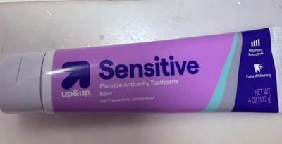 Achieve a brighter smile with this Extra-Sensitive Whitening Toothpaste from up&up™. With sodium fluoride as the primary active ingredient, this toothpaste whitens teeth, helps prevent cavities and helps protect against painful sensitivity of the teeth. Suitable for ages 12 and above, this toothpaste is a must-have addition to your dental care routine.