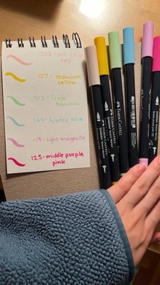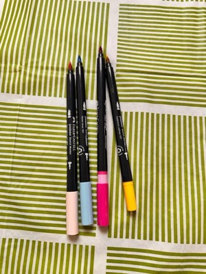 [This review was collected as part of a promotion.] I love these colors! So bright and vibrant. I especially love that they have a dual end. One side is like a felt pain brush and the other a pen. For brush like strokes and precise writing. These markers glide so smooth with erase and no bleed through. I’m excited to use them more they even come with a page with the matching number to swatch your colors
