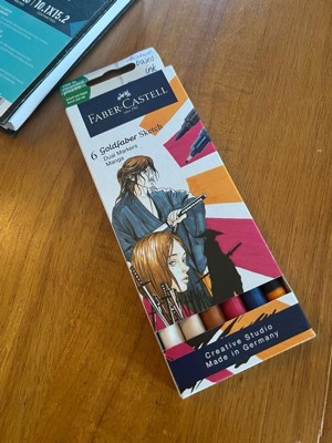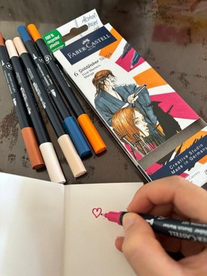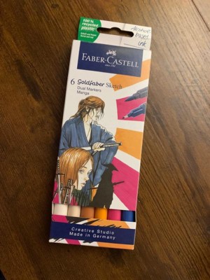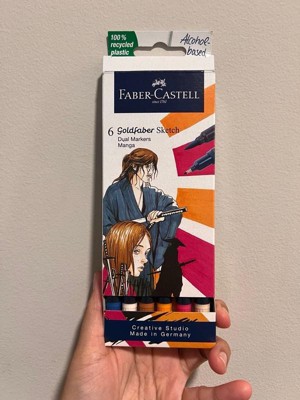 Bring your cartoons, character illustrations, and more to life with Faber-Castell Goldfaber Alcohol Sketch Markers in 6 manga-themed colors. These dual-sided markers are perfect for coloring, doodling, and drawing. They have fast-drying, smudge-free ink and are also odorless, pH-neutral, and acid-free, making them suitable for all skill levels, from beginner to expert. You can create beautiful shading, layering, and 3D effects with vibrant colors. Blending is easy, giving you smooth gradients on paper. These markers have two tips: a fine tip (0.6mm) for details and a brush tip (1mm to 5mm) for broader strokes. Each marker's cap and barrel are crafted from 100% post-consumer recycled material and may show color variations due to production. The Faber-Castell Goldfaber Alcohol Sketch Markers - Manga 6 Count Set includes the following colors: 132 Beige Red, 281 Sand, 383 Light Burnt Siena, 111 Cadmium Orange, 127 Pink Carmine, and 450 Indigo. Since 1761, Faber-Castell has proudly created art products designed to inspire creativity for all skill levels.