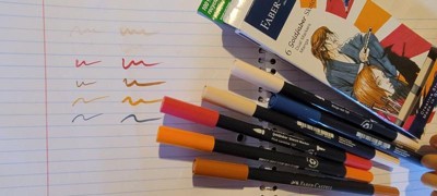 [This review was collected as part of a promotion.] As someone who always wanted copic markers as a teenager but couldn't afford them, these Faber-Castell markers make my past childhood- self ecstatic. They definitely seem intimidating to use at first since the colors are so vibrant when used, but they dry down to a softer, blendable, and buildable shade. I just did a quick sketch with them, and they're a lot of fun to play around with. I'd definitely recommend giving them a try if you have any interest in using markers as an art medium.