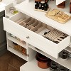 - This pantry cabinet includes 4 door cabinets and plus 1 pull-out drawers provide ample storage space to keep mugs, jars, plates and bowls organized. The open countertop is perfect to store your microwave oven, toaster, electric cooker, baking accessories.
