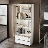 Dimensions: 78.7”H × 31.5”W × 14.2”D. white frame, glass doors, 4 shelves, 2 drawers.