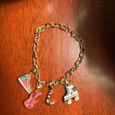 Cheap but cute. I bought this bracelet and four charms (the guitar, the roller skate, the high top sneaker, and a letter initial). The charms are colorful and fun. Each item cost five dollars. The link bracelet is adjustable. It’s large enough to fit an adult’s wrist but can be fitted to smaller wrists depending on which link you hook the lobster claw clasp to. My only gripe is that these were difficult to get out of the packaging. The adhesive dots on either side of the package that holds the lid in place are hard to remove, and the charms are secured to the backing cardboard by zip ties. Scissors were needed to get everything out of the packaging. The bracelet and charms would make great stocking stuffers for kids but adults will need to take everything out of the packaging.