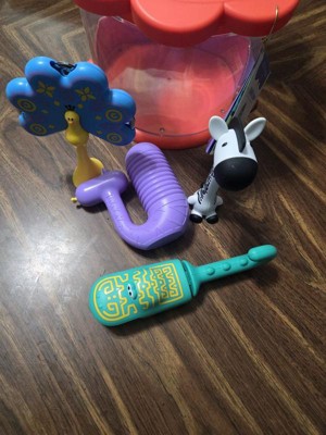 [This review was collected as part of a promotion.] This little drumset is adorable. I love that everything can be stored inside the drum for easy storage and clean-up. The butterfly is a tambourine. The alligator is a clapper. The zebra is a maraca. The snake is well to me, I would call it a washboard, but I do not know the instrumental term for it. Sorry about that. All of the pieces are made very well. The alligator is my granddaughters favorite. She will play with this set for hours and bring me an instrument to play with her.