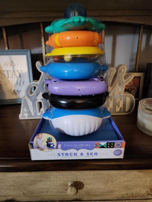 [This review was collected as part of a promotion.] This FAO Schwarz - Toy Stack Tower Sea Creatures is reall cute and keeps a baby entertained and engaged for a long time. It also reiforces a lot of fine and gross motor skills stacing the creatures up on the post. All the rings represent a different sea creature and have a different size and shape and one of the rings is also a rattle. They have lots of different surfaces and angles for a child to grasp and explore. The rings are bright colors a baby will love. This toy made a perfect baby shower gift because its safe for new borns on up for lots of playtime. The plastic is very easy to wash and keep clean which is a definite plus!