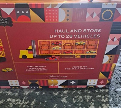 Transport your diecast car collection in style with the FAO Schwarz® Big Cab Auto Hauler Race Car Storage Set. This impressive set includes a realistic semi-truck and auto hauler trailer that rolls, swivels, and detaches for dynamic play. The spacious 1:16 scale trailer can haul and store up to 28 vehicles, making it ideal for avid diecast car collectors. Included in the set are six diecast race cars, ready to hit the road. The trailer measures 15.5” x 5.75”, with individual car spaces measuring 3” x 1.5” x 1.5”, perfectly sized for your favorite diecast models. Whether displaying your collection or transporting cars to the next race, this hauler set combines functionality with fun, making it a must-have for any car enthusiast.