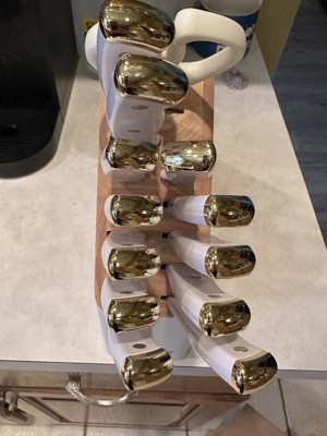 These knives look great in my new white kitchen. I love that they are white with gold accents. The only thing I don’t care for is that the base is abnormally long. They do stick out quite a bit from the wall. They should be ok in a corner.