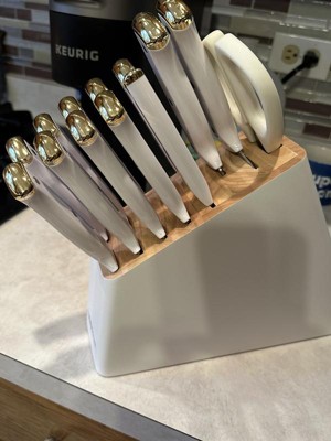 The Farberware Triple Rivet 14-Piece White and Gold Slim Block Set is both stylish and functional. The white and gold finish gives it a modern look, and the slim block design saves counter space. Each knife is sharp, balanced, and easy to handle, making food prep a breeze. With essentials like kitchen shears and a built-in sharpener included, this set is a perfect blend of style and practicality for any kitchen.