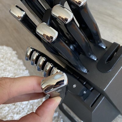 Always have the right sharpened knife on hand, with this Farberware Triple Rivet Black Cutlery Block Set with Built-In Edgekeeper® Sharpener. Each knife has a fine edge, high-carbon stainless steel blade and ergonomically designed plastic handle that provides a comfortable grip. The set features black handles with triple rivets and endcap accents in a graphite painted hardwood block that complements any decor and keeps all your essential knives organized and within reach on your countertop. This unique block also features an Edgekeeper(R) Sharpener slot. If you need to sharpen a blade, simply slide it through the slot for a quick and convenient edge enhancement. 14-piece set includes: 8-inch chef knife, 8-inch slicing knife, 5-inch Santoku knife, 5-1/2 inch serrated utility knife, 5-1/2 inch fine edge utility knife, 3-1/2 inch paring knife, six 4-1/2 inch steak knives, all purpose shears, and natural hardwood storage block with built-in sharpener. Hand-wash knives with warm water and a mild detergent then rinse and dry immediately. Stainless steel knives are not dishwasher safe.