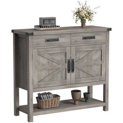 Product Description This entryway table with storage space features gray tones that embody charming farmhouse style, adding rustic elegance to your space. Its clean lines and serene beauty complement any furniture style, creating a fresh and inviting atmosphere.With a versatile design and large amount of storage, this practical furniture piece serves as a side table or coffee bar in the living room, a buffet sideboard in the kitchen, a console table in the hallway, or a nightstand beside your bed.