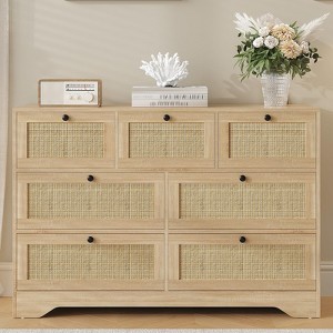 Farmhouse Modern 7-Drawer Dresser, Rattan and Wood Storage Organizer Chest for Bedroom Closet Living Room Entryway, Oak