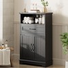 Bring timeless farmhouse charm to your home with this versatile storage cabinet. Featuring a wood-grain top, paneled design, and vintage black hardware, it adds cozy elegance to any space. With a drawer, open shelf, and double-door cabinet, it offers ample storage for towels, dishes, or pantry items. Use it as a coffee bar, bathroom cabinet, or entryway console. Built from durable MDF with a reinforced top, it’s perfect for daily use. Easy to assemble with clear instructions, it’s a stylish and practical addition to any room.
