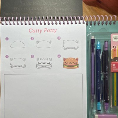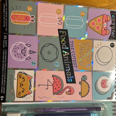 Embark on a creative adventure with the Learn to Draw Food Animals Sketch Set. This set includes everything a budding artist needs to learn how to draw: 25 Step-By-Step Guided Instruction Pages, 10 Sketch Sheets, 3 Mechanical Pencils, 12 Color Refills, and 1 Eraser.Take a break from screens with this cute kawaii sketch book set. These instructional coloring book pages are perfect for flexing your creative muscles. Learning to sketch is great for promoting focus, concentration, and hand-eye coordination.