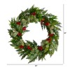 Like the trendy, messy look? If you love Christmas but are looking for something a bit more modern, this Christmas artificial wreath will make you feel nostalgic yet in vogue. Scores of cedar and eucalyptus in vivid hues are accented by berries. Crafted from high-quality materials, this modern wreath will make an inviting greeting for all. With a diameter of 24in., house this piece in any room in need of some Christmas cheer. Makes a fine gift as well. Artificial wreaths are manufactured using synthetic materials, such as polyester material or plastic, and are well designed and constructed to be life-like in appearance. This item will need to be re-shaped when removed from the security box to allow it to reach its fullest size. Your wreath will look beautiful for years to come; simply wipe it clean with a soft dry cloth when needed.