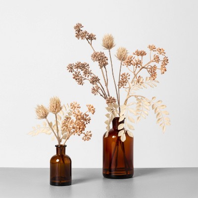Bring added interest to desks, shelves, dressers and more with the Faux Bleached Thistle & Sedum Arrangement from Hearth & Hand™ with Magnolia. Set in an amber glass vase for an appealing, down-to-earth look, this artificial floral arrangement is composed of faux dried sedum, faux dried thistle stems and faux leaf stems in a light cream color. The neutral tones make it easy to work into a range of color schemes and decor styles, and the faux dried stems have a timeless appeal that works any time of year for a versatile decor piece you'll love.