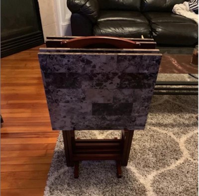 [This review was collected as part of a promotion.] This are very elegantly folding trays, the faux marble is very heavy topped and gives a class to your living room or where ever you place them in your home, there is no assembly needed, the heavy top won’t tip over as it’s very durable, it can go with anything in your home, the legs are wooden that can withstand any item you place on these table s it comes with 4 tables, with a stand that has a handle to be placed anywhere, you like, it’s durable & stable, not like your mom’s or grandma’s set of folding trays it adds a touch of class.