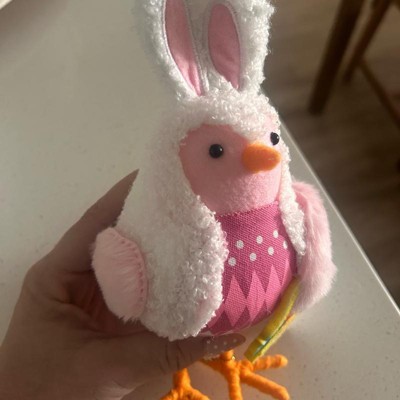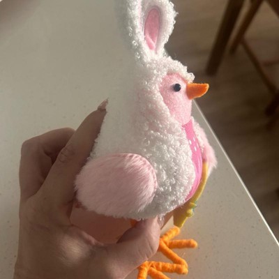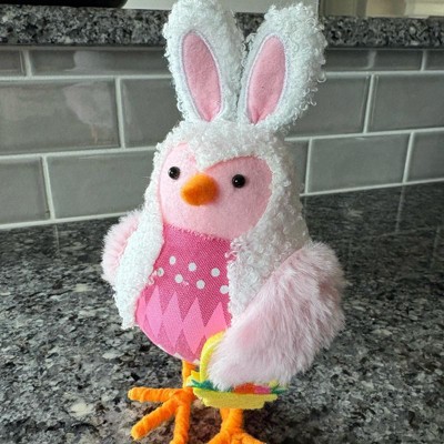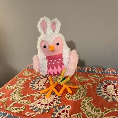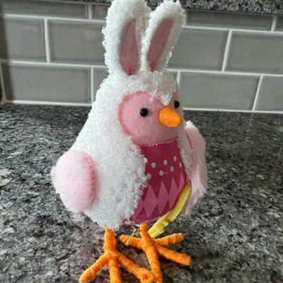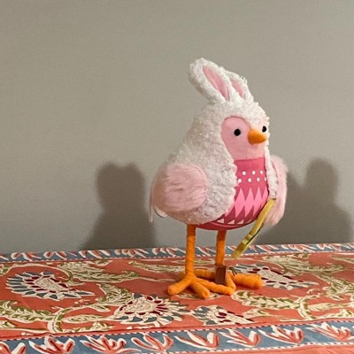 This pink feathered figurine is an absolute standout for anyone looking to add a playful and imaginative touch to their seasonal decor. The design is incredibly creative, featuring a soft pink bird dressed in a fuzzy white "bunny" hood complete with tall pink ears. Every detail is thoughtfully crafted to bring a sense of joy, from the vibrant patterned body to the bright orange wire feet that give it a sturdy yet delicate stance.