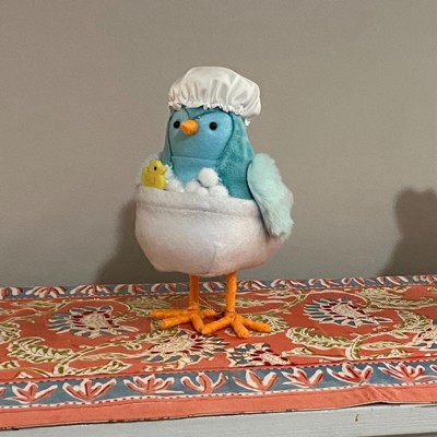 This blue bird "bubble bath" figurine is an absolute standout for anyone looking to add a playful and imaginative touch to their seasonal decor. The design is incredibly creative, featuring a small blue bird nestled inside a white "tub" filled with fluffy white bubbles and even its own tiny, smiling yellow rubber ducky. Every detail is thoughtfully crafted to bring a sense of joy, from the ruffled white satin shower cap to the vibrant orange wire feet that give it a sturdy yet delicate stance. The color palette is bright and cheerful, making it a perfect accent piece for a sunny shelf or a springtime mantel display. It feels like a high-quality, modern-classic collectible that is sure to spark a smile from anyone who sees it.
