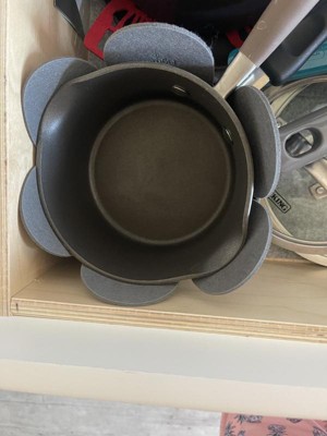 Good pots and pans are expensive to replace and the non-stick surface can easily get damaged. These Felt Pan Protectors in gray by Figmint are not fancy but they are super functional. The material itself resembles a sort of compressed felt, but not the craft-type felt. These are really nicely thick and padded. Since there are three in the set, I was able to use them for my frying pans. I will be purchasing more sets for the pans and corning ware. These protectors work so great and are so easy to toss into the clean pan as I put it away. The Felt Pan Protectors will not lose their shape and are just the perfect amount of thickness. These are going to last a few years. I should not have to, but it is nice to know that I can just hand wash these with no problems. I feel so much better protecting my pans with these felt pan protectors. Plus, it is so much quieter when I put these between the pans. The flower design in the center is not just to make it look pretty. It is there so these are more flexible for pans and corning ware. They just mold into the shape that is needed. Such a smart purchase and a great price. We love having them.