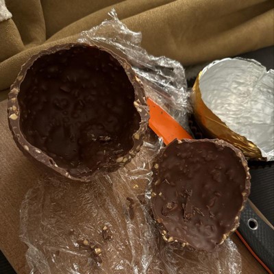 this is completely hollow. it doesn't even have the wafer layer. it is only a shell. yes it says hollow on the label but why would you read the label when you are enticed by the promise of a giant Ferrero Rocher. this shocked me to my core and tbh in a way it feels like a betrayal. proceed at your own risk