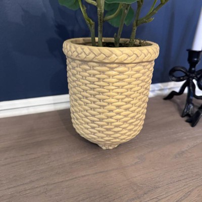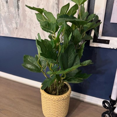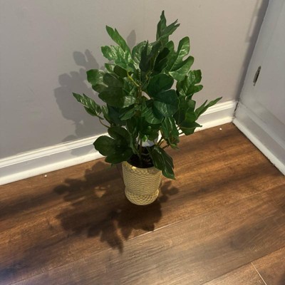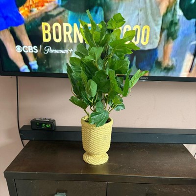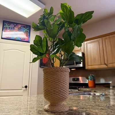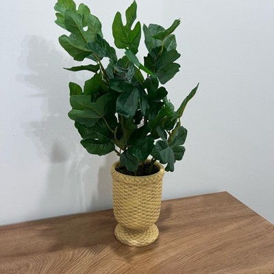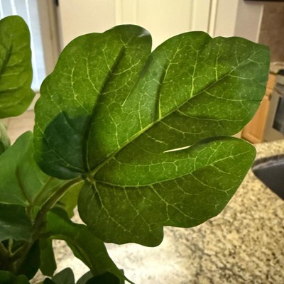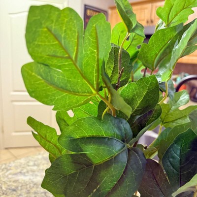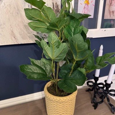 [This review was collected as part of a promotion.] This 21 inch fig leaf arrangement by threshold is super realistic looking. It sits in a woven basket looking ceramic vase. This would be perfect for anyone who does not have a green thumb as this looks very real, and it is very lush with the greenery of the fig leaves. Put us in any room that you're looking for a tropical feel.