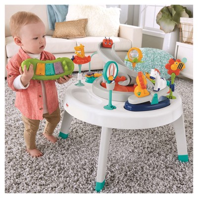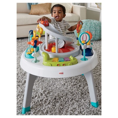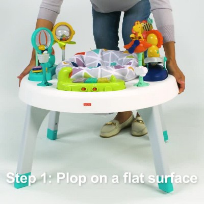 Your little monkey will have a blast in this 2-in-1, safari-themed entertainer—it "grows" along with your child! As your baby sits in the comfortable fabric seat, a platform full of animal toys and exciting activities encourage your little one to spin around and explore all 360 degrees of fun. Then, when your toddler is ready, convert the 2-in-1 Sit-to-Stand Activity Center to a play table and attach the ramp for sliding play! Fun songs and sounds reward your baby's actions, keeping the exploring fun going and going.
