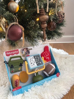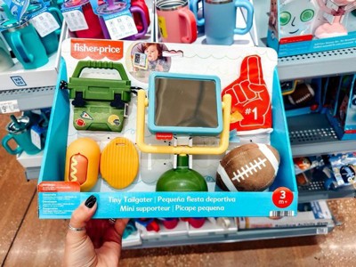 Baby can score a touchdown of sensory play with this Mini Me Moments Tiny Tailgater Set from Fisher-Price. Featuring classic newborn activity toys styled like familiar items from a football game tailgate, this 6-piece set includes a crinkle cooler, plush football, crinkle “foam finger,” roller hot dog, teether chip, and a goal post-themed mirror that spins. These adorable toys help little sports fans develop sensory skills, fine motor skills, and cause & effect. Colors and decorations may vary.