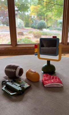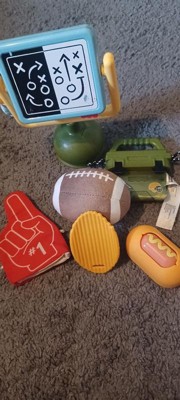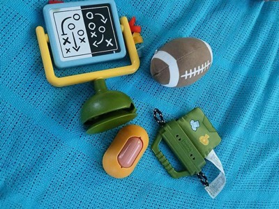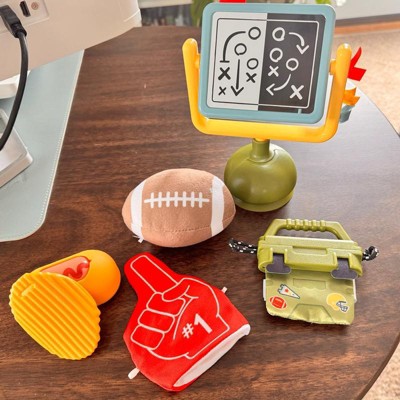 - Includes crinkle cooler, plush football, crinkle “foam finger,” roller hot dog, teether snack chip, and a mirror styled like a goal post with a suction button