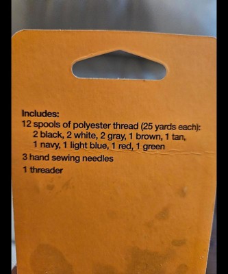 The Fiskars® Hand Sewing Thread Pack is ideal for crafting or for making simple repairs to fabric. This package contains 12 spools of poly thread (25 yards each), 3 needles and a needle threader.