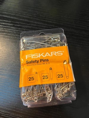 - INCLUDES: 1 Fiskars Assorted Safety Pin Set; 25 size 00 pins (3/4" long), 25 size 2 pins (1 1/2" long), and 25 size 3 pins (2" long)