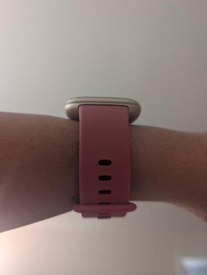 I love the soft, neutral pink color, which helps it go with a lot of stuff. The size is small, and it's the same size that came with the watch, if that helps. Flexible but study-feeling material. Doesn't irritate my skin and is waterproof/sweatproof.
