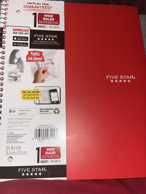 LASTS ALL YEAR. GUARANTEED!* The Five Star® Active Notebook features a fun, bold design and glossy accents against an Orange background. Compatible with the Five Star Study App, so you can easily scan, study and organize notes on your phone! Create digital flashcards and sync notes to Google Drive and access them anywhere. This notebook has 80 double-sided, wide ruled sheets, which fight ink bleed. Tough pockets help prevent tears and hold 8" x 10 1/2" sheets, and our water-resistant front cover and Spiral Lock® wire binding help keep your notes safe and secure. *Guarantee is valid for one year from purchase or delivery date, whichever is longer. Does not cover misuse.