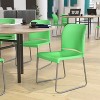 Provide comfortable seating in your lobby, cafeteria, breakroom, auditorium or office with this appealing sled base stack chair. Plastic stack chairs are popular chairs for temporary or permanent seating solutions and are ready-to-use with a fully assembled design. The green powder coated sled base chair is stylish enough to be used as your modern dining chair and are easy to clean. Create an engaging atmosphere by using different colors in your training room or open workspace. Working in open industrial style offices can be distressing, adding colorful stack chairs around collaborative tables can make the space fun and inviting. These stackable guest chairs are designed to withstand constant use to keep up with the daily demands of your business. For transporting efficiency acquire our steel stack chair dolly